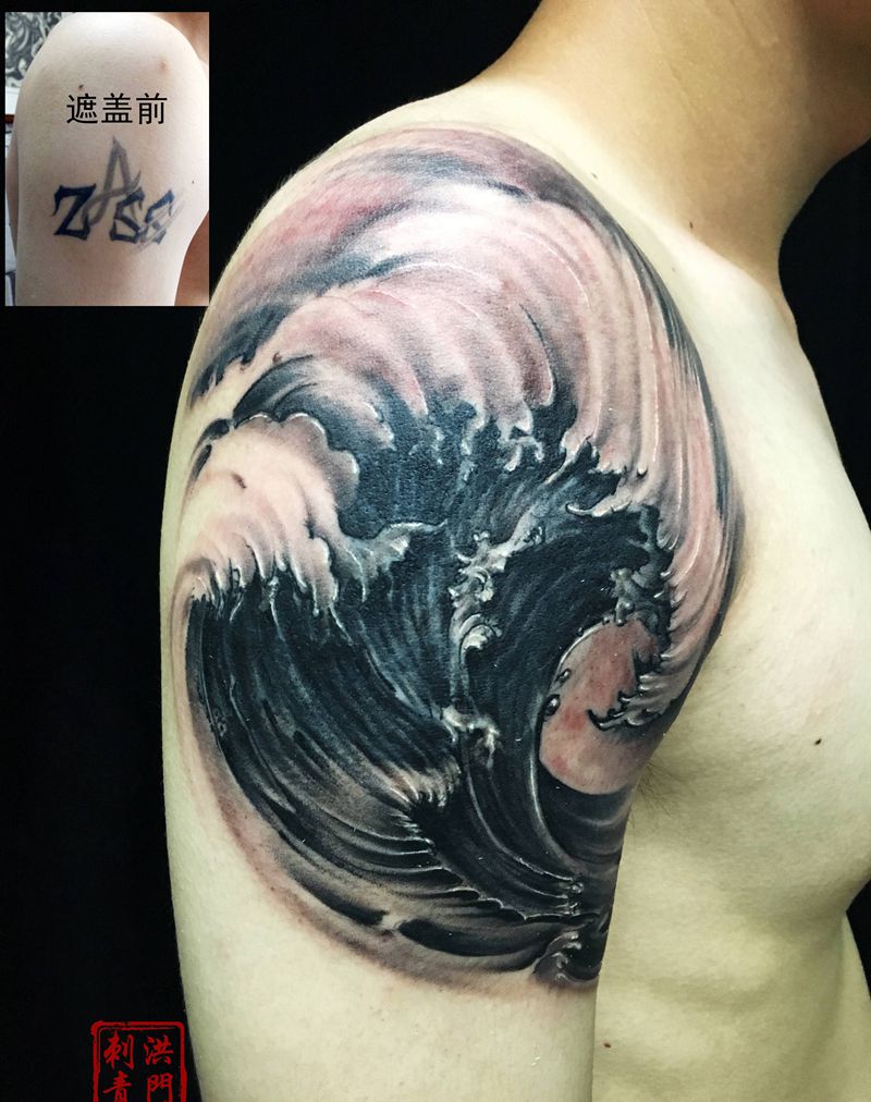 遮盖前女友1纹身图片_手臂肩部新传统水浪遮盖同城纹身图案