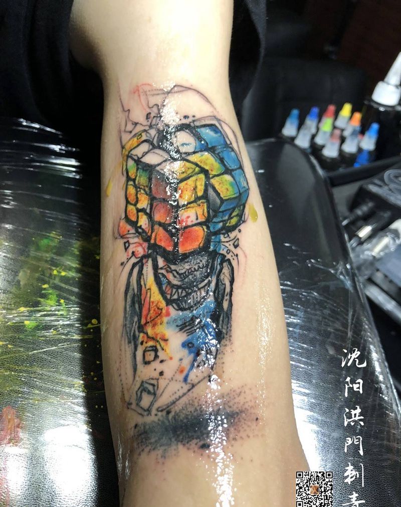 当前位置: 首页 >辽宁省沈阳市纹身店-沈阳洪門刺青纹身图案>魔方纹身图片_手臂手部New School水彩纹身图案