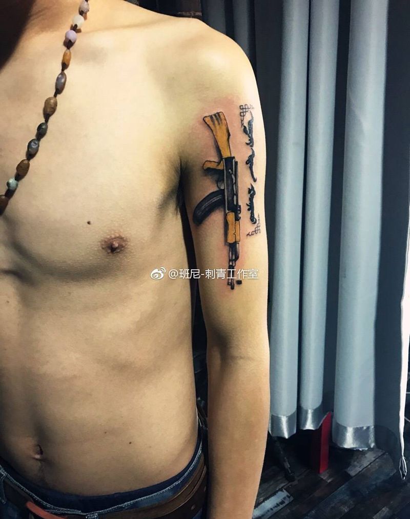当前位置: 首页 >内蒙古鄂尔多斯市纹身店-班尼刺青工作室纹身图案>英文,枪。梵文。蒙语纹身图片