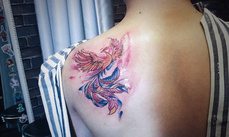 当前位置: 首页 >内蒙古鄂尔多斯市纹身店-班尼刺青工作室纹身图案>凤凰纹身图片_肩部水彩纹身图案