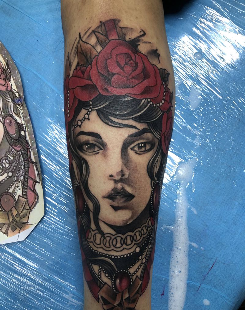• T包小腿吹火男+阿多福纹身图片_腿部老传统新传统吹火男阿