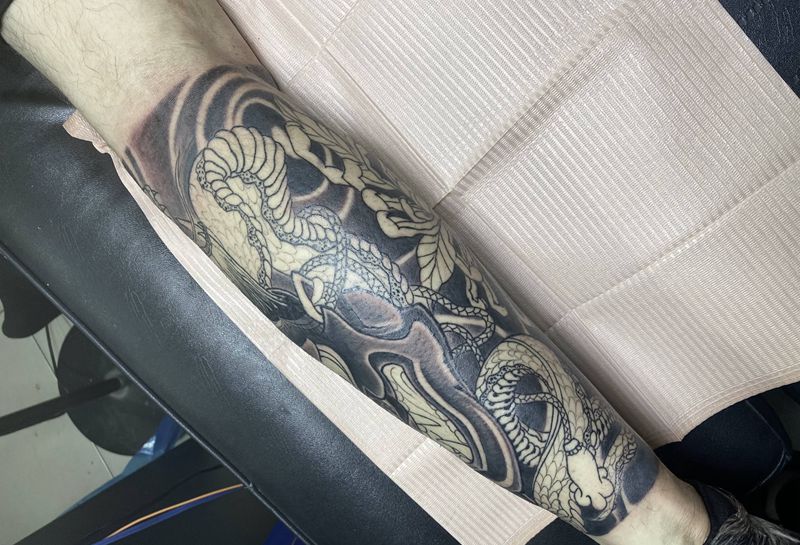 • T网红王老大花腿龙纹身图片_腿部新传统纹身图案