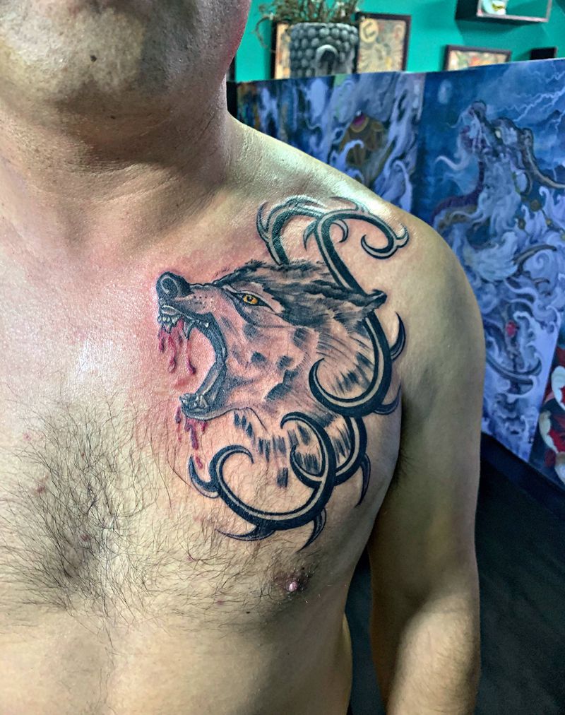 狼头纹身图片_胸部纹身图案