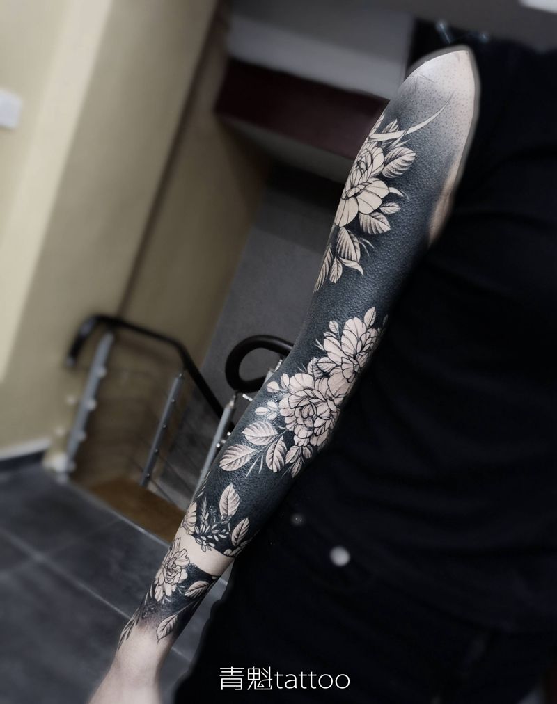 当前位置: 首页 >内蒙古乌兰察布市纹身店-青魁刺青纹身图案>黑臂素花纹身图片_手臂图腾纹身图案