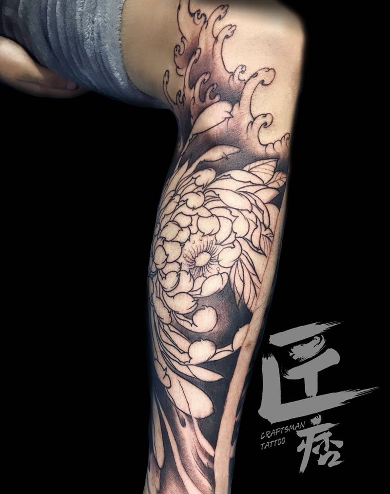 菊花般若包小腿纹身图片_腿部新传统纹身图案