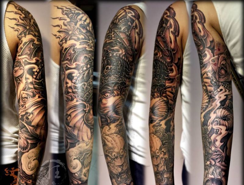 当前位置: 首页 >辽宁省沈阳市纹身店-旺刺青纹身工作室纹身图案>象神花臂纹身图片_成品手臂欧美传统鬼神纹身图案