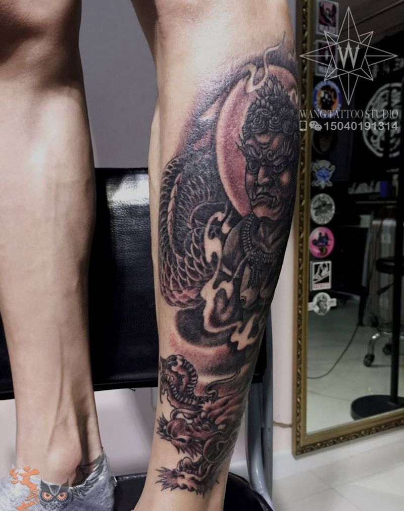 当前位置: 首页 >辽宁省沈阳市纹身店-旺刺青纹身工作室纹身图案>不动明王纹身图片_成品腿部传统人物鬼神动物纹身图案
