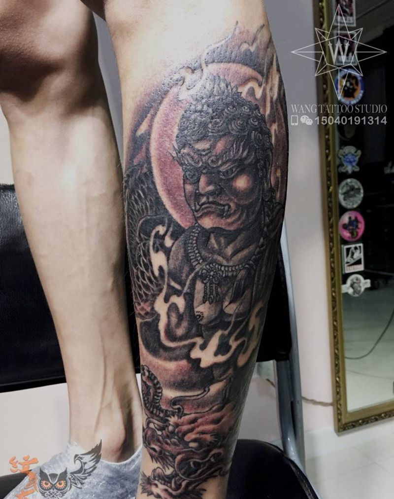 当前位置: 首页 >辽宁省沈阳市纹身店-旺刺青纹身工作室纹身图案>不动明王纹身图片_成品腿部传统人物鬼神动物纹身图案