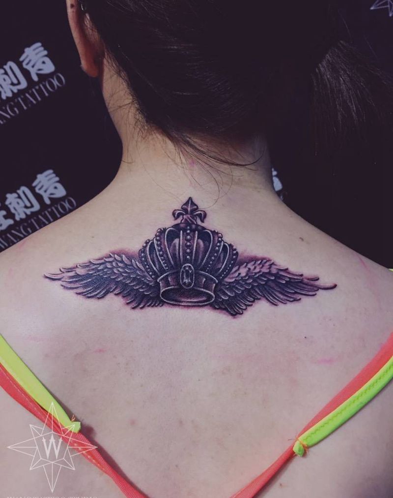皇冠翅膀纹身图片_成品颈部欧美静物纹身图案