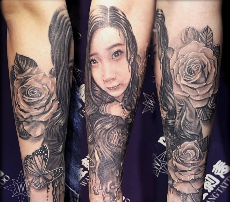 当前位置: 首页 >辽宁省沈阳市纹身店-旺刺青纹身工作室纹身图案>肖像玫瑰花纹身图片_成品手臂欧美清新肖像植物动物纹身图案