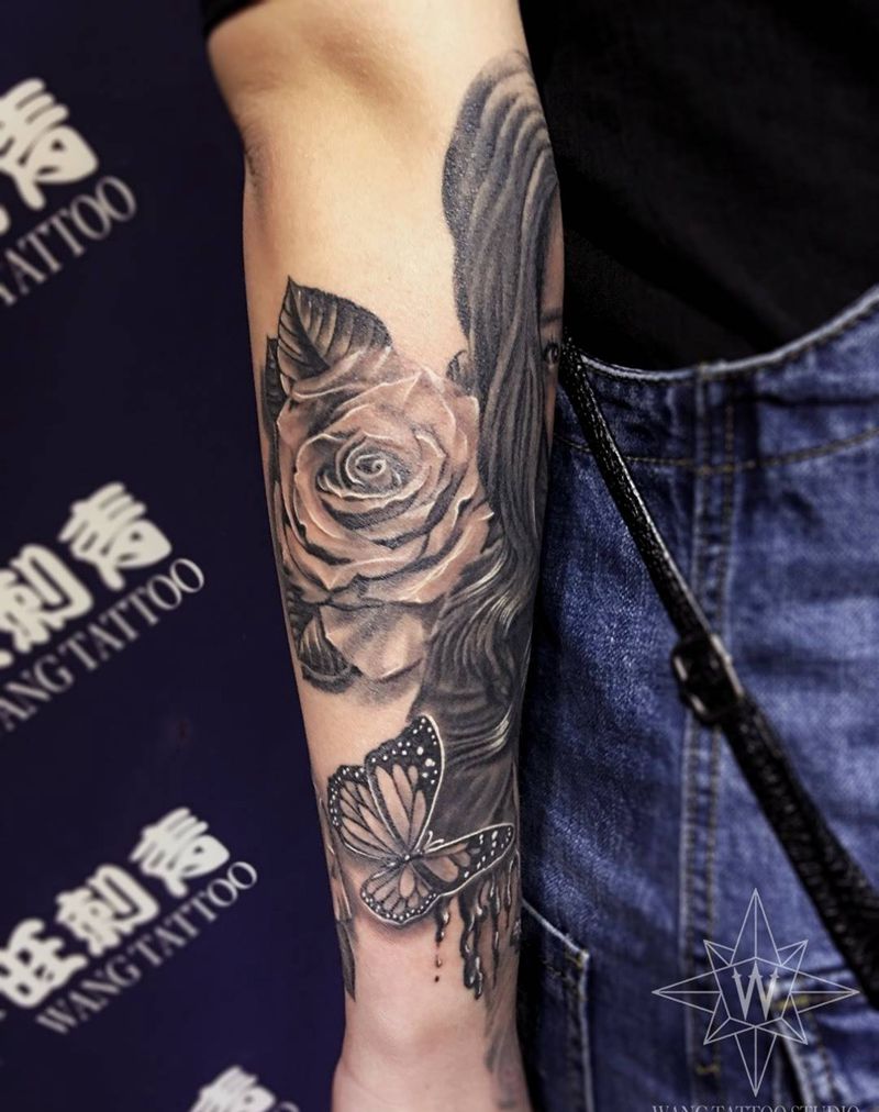 当前位置: 首页 >辽宁省沈阳市纹身店-旺刺青纹身工作室纹身图案>肖像玫瑰花纹身图片_成品手臂欧美清新肖像植物动物纹身图案