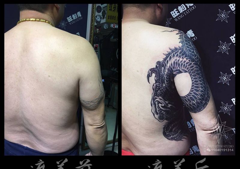 当前位置: 首页 >辽宁省沈阳市纹身店-旺刺青纹身工作室纹身图案>修改遮盖披肩龙纹身图片_成品胸部手臂腹部传统鬼神纹身图案