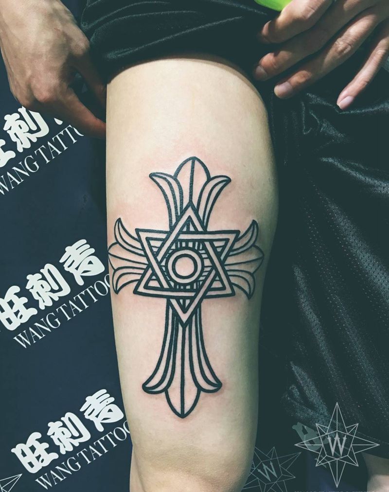 克罗心十字架✟纹身图片_成品腿部欧美几何纹身图案