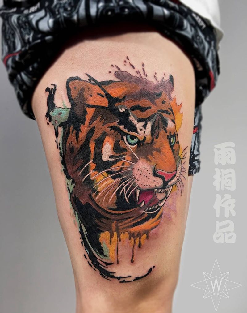 当前位置: 首页 >辽宁省沈阳市纹身店-旺刺青纹身工作室纹身图案>泼墨虎头纹身图片_成品腿部欧美动物纹身图案