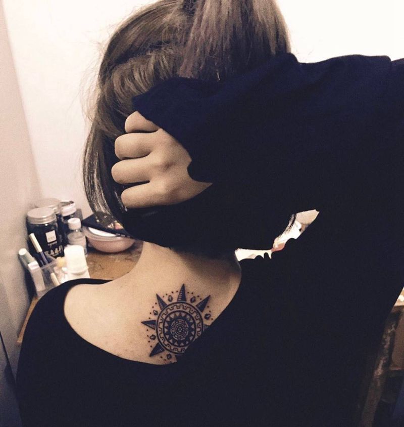 太阳花纹身图片_成品颈部欧美图腾几何纹身图案