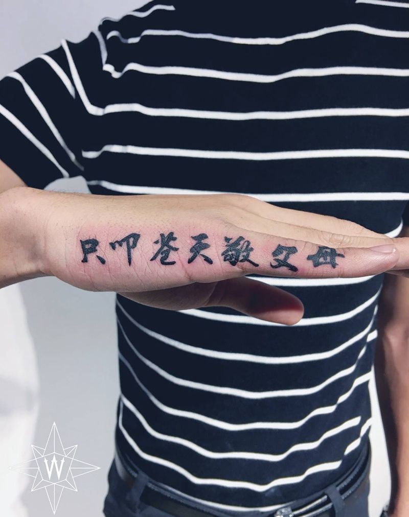当前位置: 首页 >辽宁省沈阳市纹身店-旺刺青纹身工作室纹身图案>只叩苍天敬父母纹身图片_成品手部传统字符纹身图案
