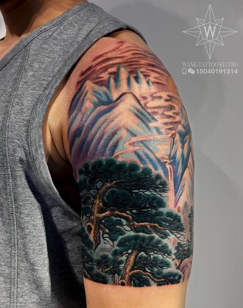 当前位置: 首页 >辽宁省沈阳市纹身店-旺刺青纹身工作室纹身图案>山水画纹身图片_成品手臂传统纹身图案