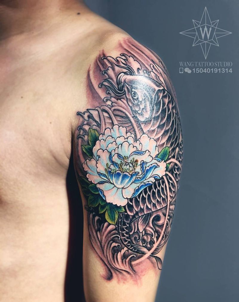 当前位置: 首页 >辽宁省沈阳市纹身店-旺刺青纹身工作室纹身图案>鲤鱼牡丹纹身图片_成品手臂传统动物植物纹身图案