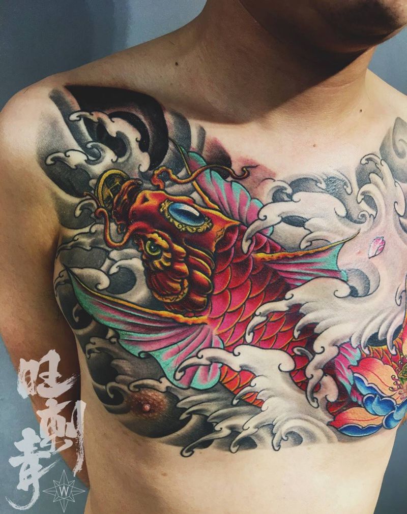 花胸鲤鱼纹身图片_成品胸部传统动物植物纹身图案