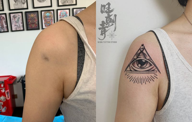 全视之眼遮盖胎记纹身图片_手臂肩部几何图腾上帝之眼全视之眼纹身图案