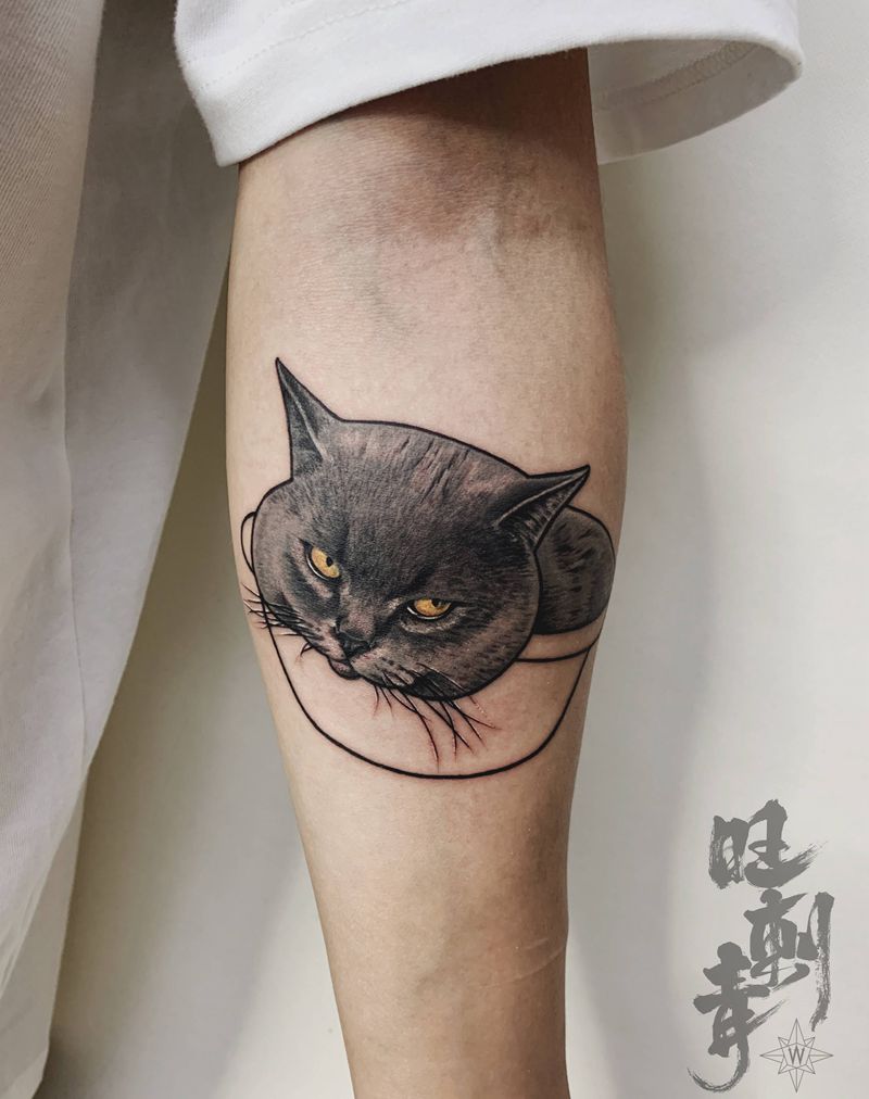 当前位置: 首页 >辽宁省沈阳市纹身店-旺刺青纹身工作室纹身图案>英短蓝猫纹身图片_手臂New School英短蓝猫猫纹身图案