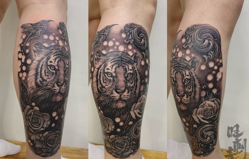 当前位置: 首页 >辽宁省沈阳市纹身店-旺刺青纹身工作室纹身图案>心有猛虎 细嗅蔷薇纹身图片_腿部欧美写实老虎蔷薇纹身图案