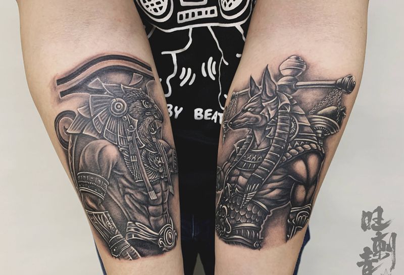 当前位置: 首页 >辽宁省沈阳市纹身店-旺刺青纹身工作室纹身图案>荷鲁斯(左)阿努比斯(右)纹身图片_手臂欧美写实古希腊神纹身图案