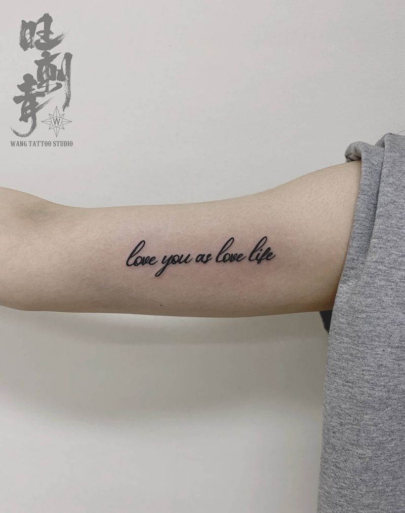 当前位置: 首页 >辽宁省沈阳市纹身店-旺刺青纹身工作室纹身图案>爱你就像爱生活纹身图片_手臂花体字英文纹身图案