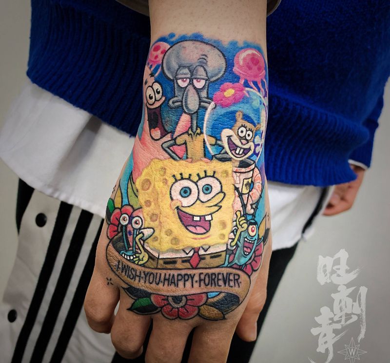 当前位置: 首页 >辽宁省沈阳市纹身店-旺刺青纹身工作室纹身图案>海绵宝宝纹身图片_手部New School欧美写实海绵宝宝纹身图案