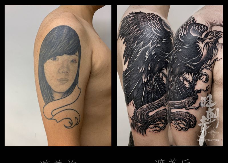 当前位置: 首页 >辽宁省沈阳市纹身店-旺刺青纹身工作室纹身图案>三足金乌纹身图片_手臂图腾欧美写实乌鸦纹身图案