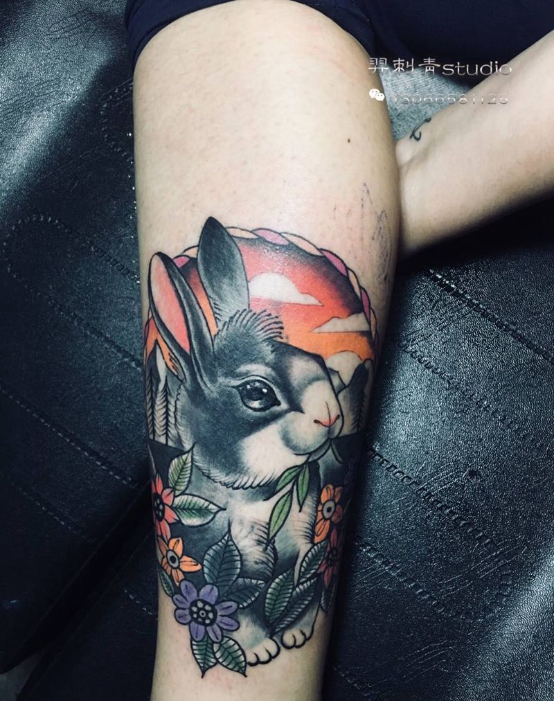 遮盖欧美兔子纹身图片_成品欧美动物腿部纹身图案