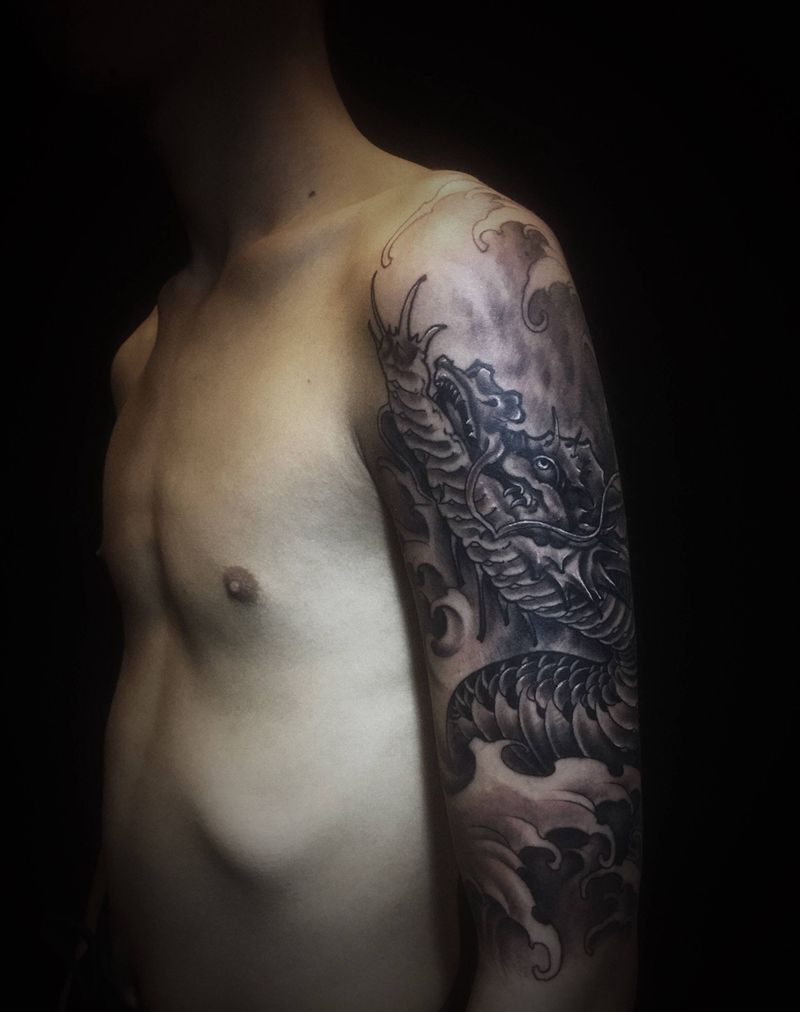 龙纹身图片_手臂新传统羿刺青龙花臂纹身图案