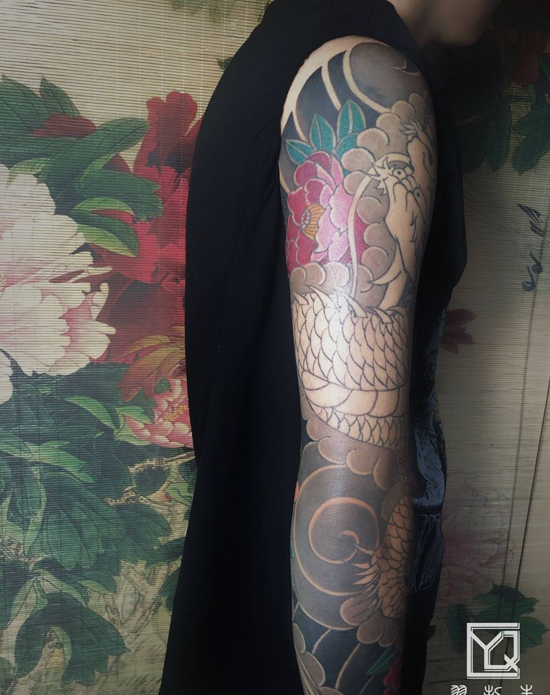 老传统花臂纹身图片_手臂肩部老传统新传统老传统日式花臂龙纹身图案