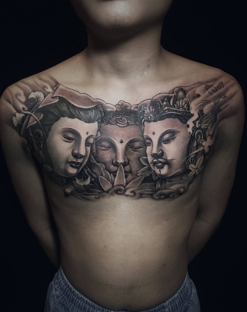 三面佛华西三圣纹身图片_胸部新传统花胸三面佛华西三圣纹身图案