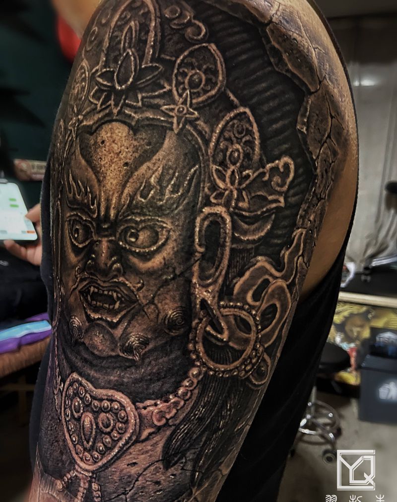 当前位置: 首页 >辽宁省沈阳市纹身店-羿·刺青纹身工作室纹身图案>石雕黄财神纹身图片_肩部腰部新传统黄财神石雕半甲花臂纹身图案