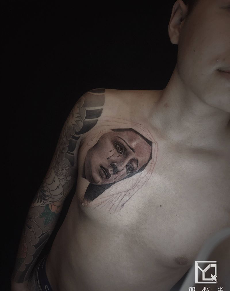 流泪的圣母纹身图片_胸部欧美写实欧美写实花胸圣母纹身图案