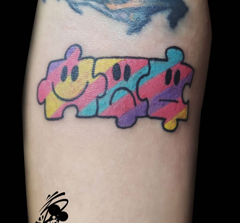 当前位置: 首页 >辽宁省沈阳市纹身店-沈阳513刺青纹身图案>拼图纹身图片_手臂New School拼图 笑脸彩虹纹身图案