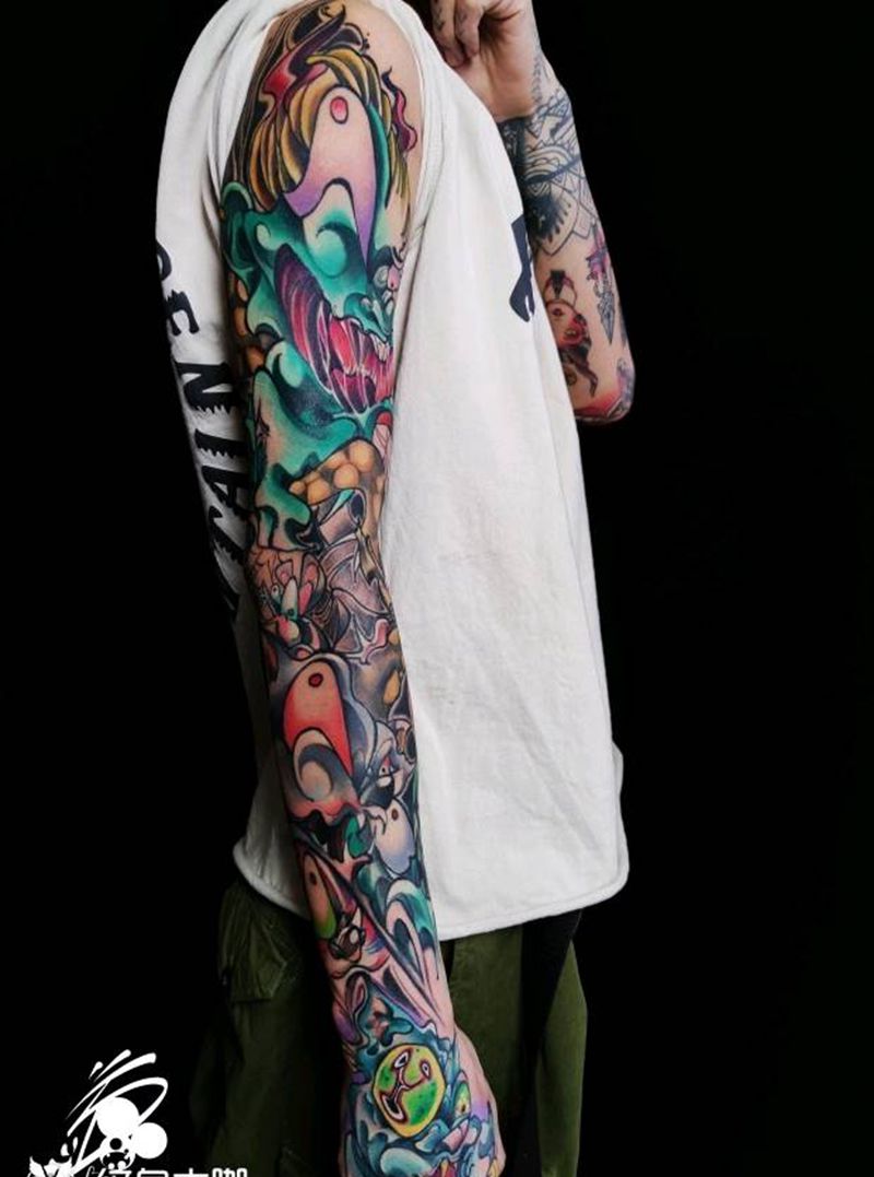 当前位置: 首页 >辽宁省沈阳市纹身店-沈阳513刺青纹身图案>原创花臂纹身图片_手臂手部New School多元素动物人物纹身图案