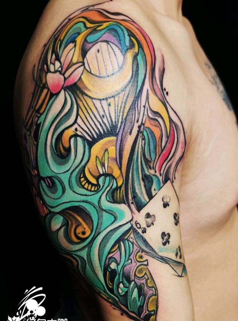 当前位置: 首页 >辽宁省沈阳市纹身店-沈阳513刺青纹身图案>原创大臂纹身图片_手臂New School仙人掌太阳月亮彩虹纹身图案