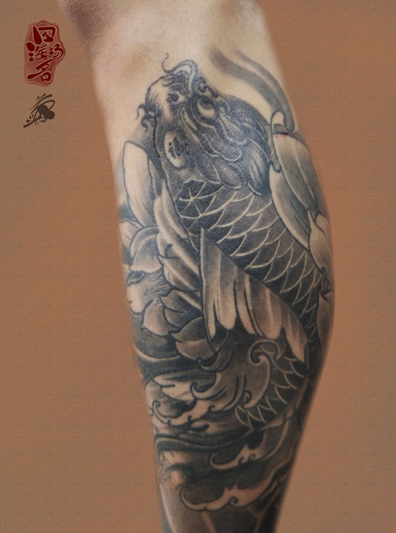 修改纹身图片_腿部老传统新传统鲤鱼荷花纹身图案