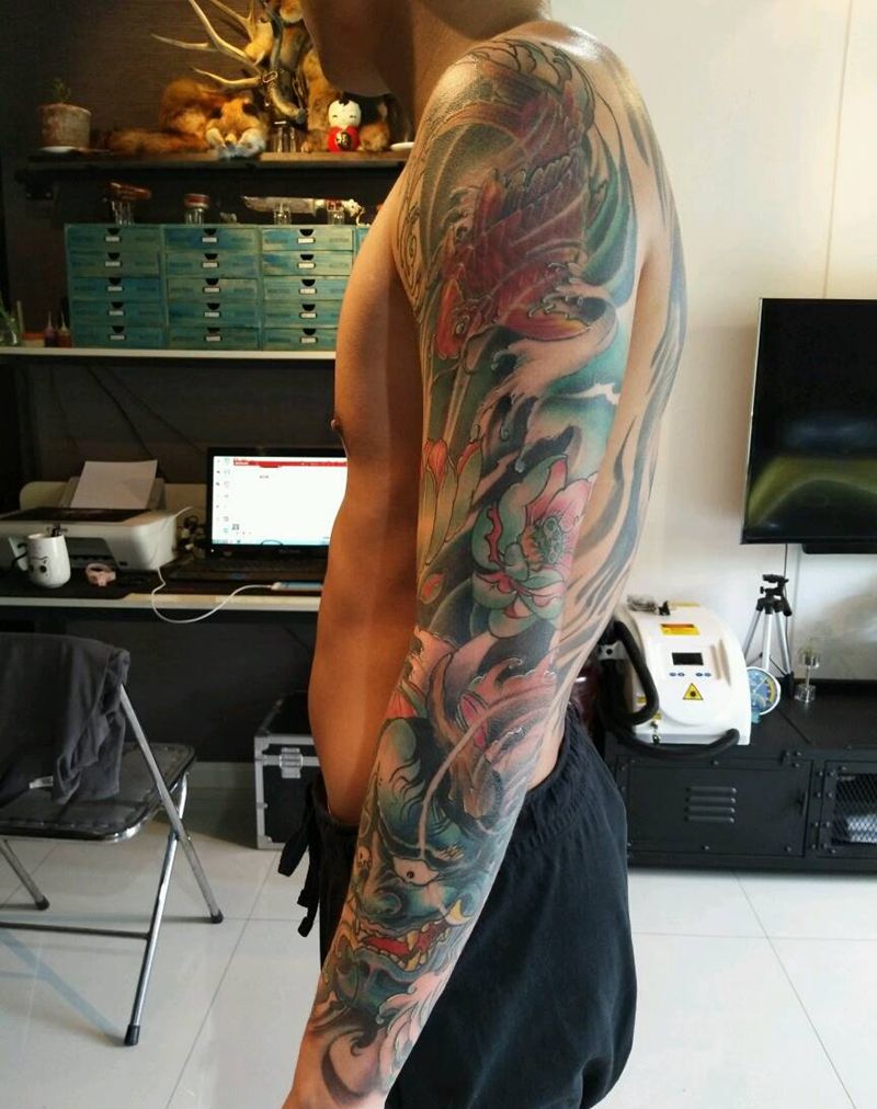 当前位置: 首页 >辽宁省沈阳市纹身店-沈阳513刺青纹身图案>原创花臂纹身图片_手臂传统动物植物静物鬼神原创成品纹身图案