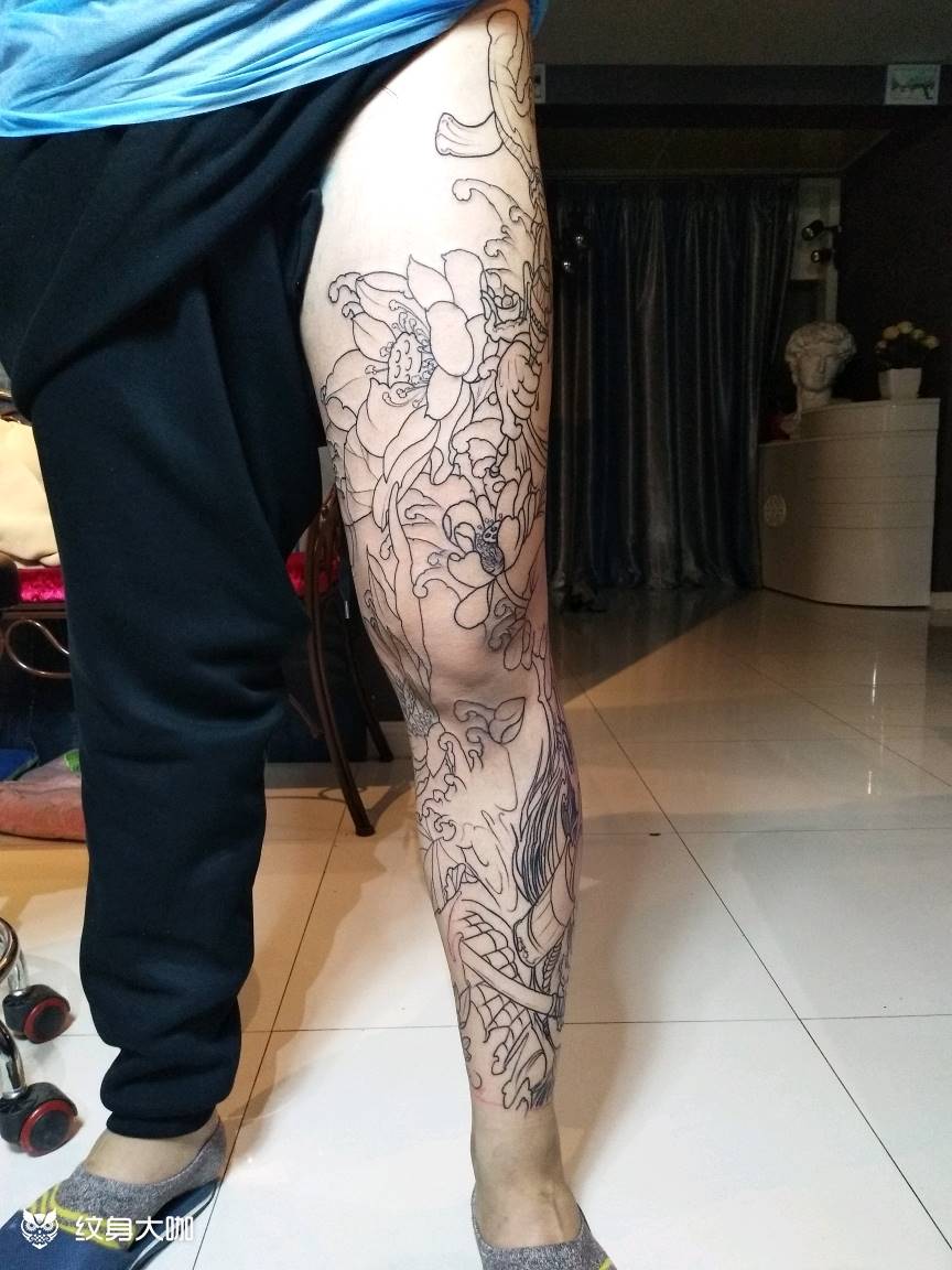 花腿未完成纹身图片_腿部传统动物植物鬼神成品纹身图案