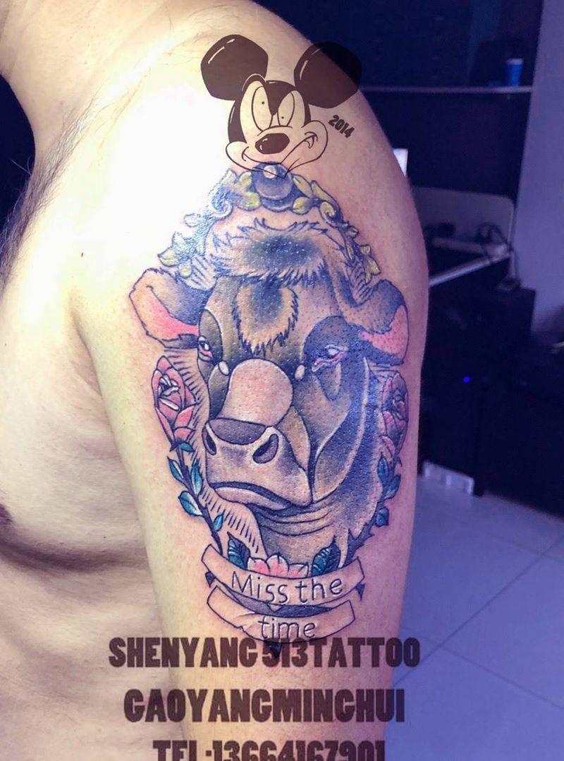 生效纹身图片_手臂Old School生效牛纹身图案