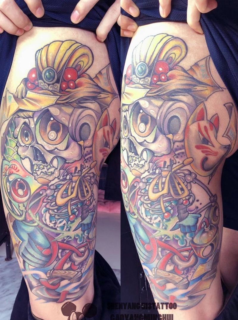 当前位置: 首页 >辽宁省沈阳市纹身店-沈阳513刺青纹身图案>原创大腿纹身图片_腿部New School猴子船锚鲤鱼旗纹身图案
