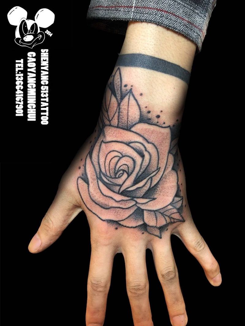 当前位置: 首页 >辽宁省沈阳市纹身店-沈阳513刺青纹身图案>手背玫瑰纹身图片_手部点刺New School玫瑰花手背纹身图案