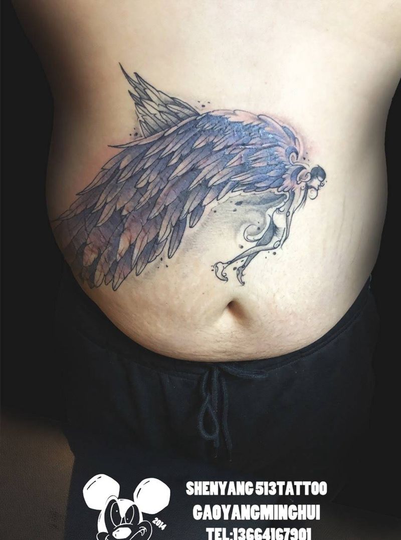 当前位置: 首页 >辽宁省沈阳市纹身店-沈阳513刺青纹身图案>遮盖纹身图片_腹部New School几何翅膀天使遮盖纹身图案