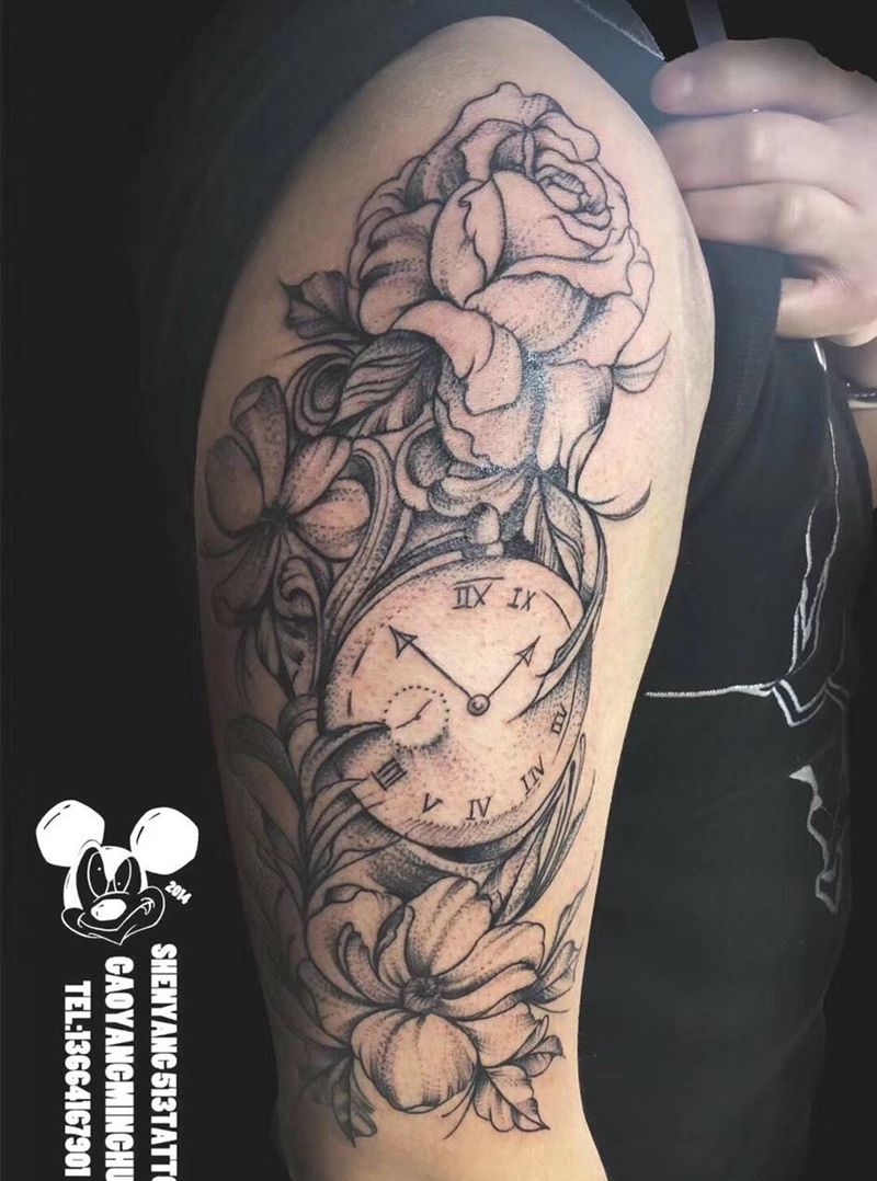 当前位置: 首页 >辽宁省沈阳市纹身店-沈阳513刺青纹身图案>时钟纹身图片_手臂点刺时钟花表纹身图案