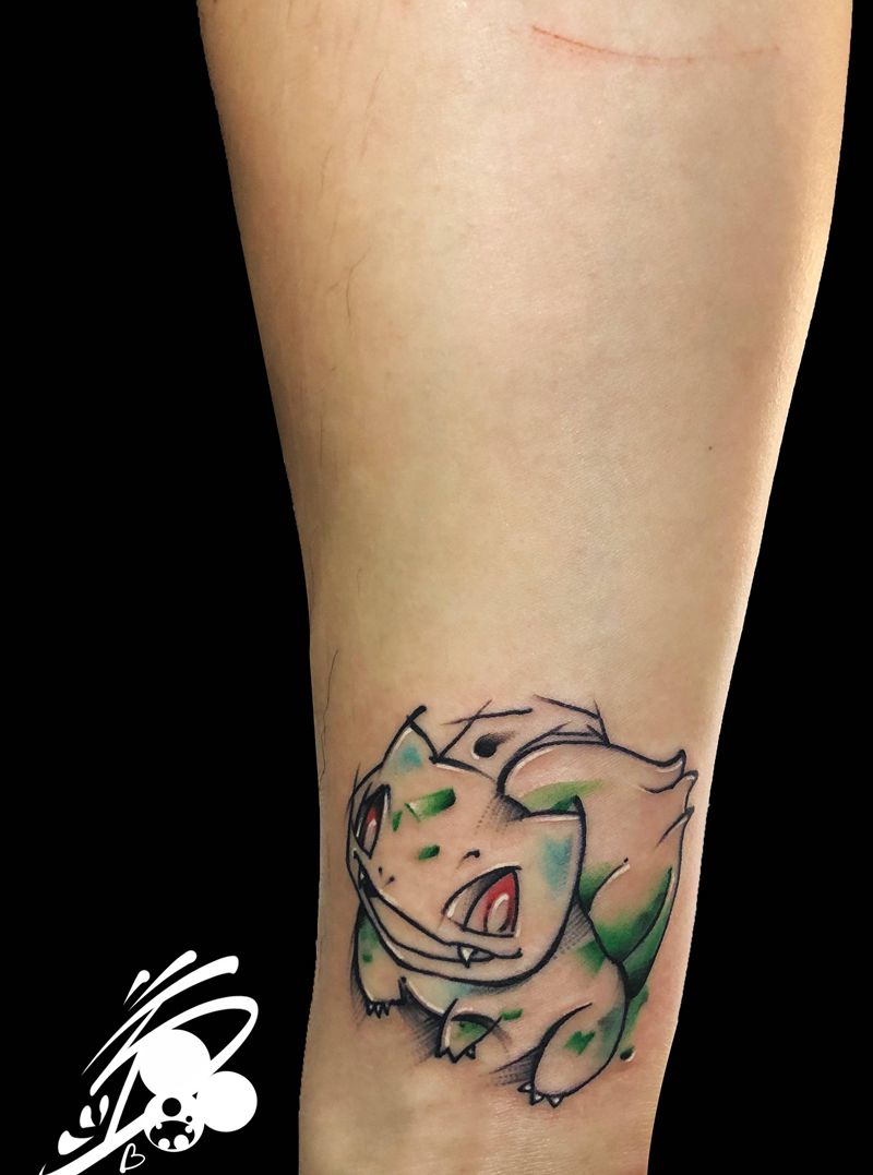 情侣妙蛙种子纹身图片_手臂New School水彩宠物小精灵妙蛙种子精灵球纹身图案