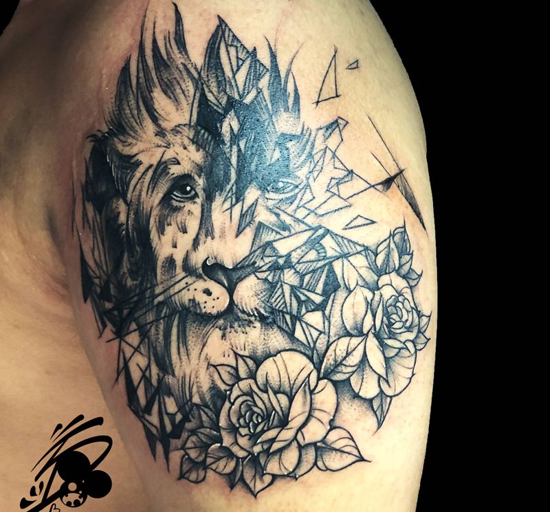 遮盖纹身图片_手臂几何点刺狮子狮子座纹身图案