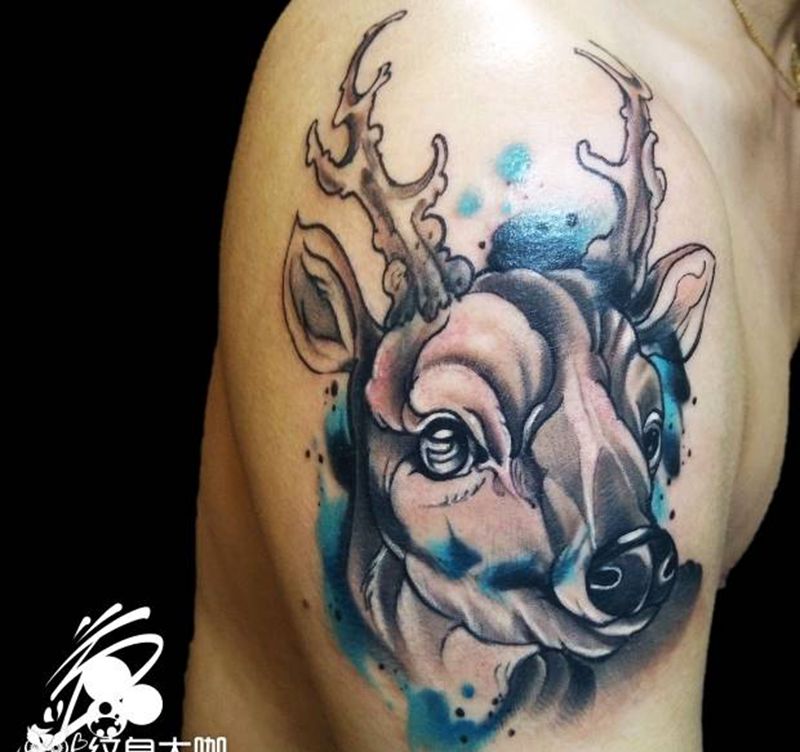 遮盖失败纹身纹身图片_手臂New School水墨鹿水彩泼墨纹身图案